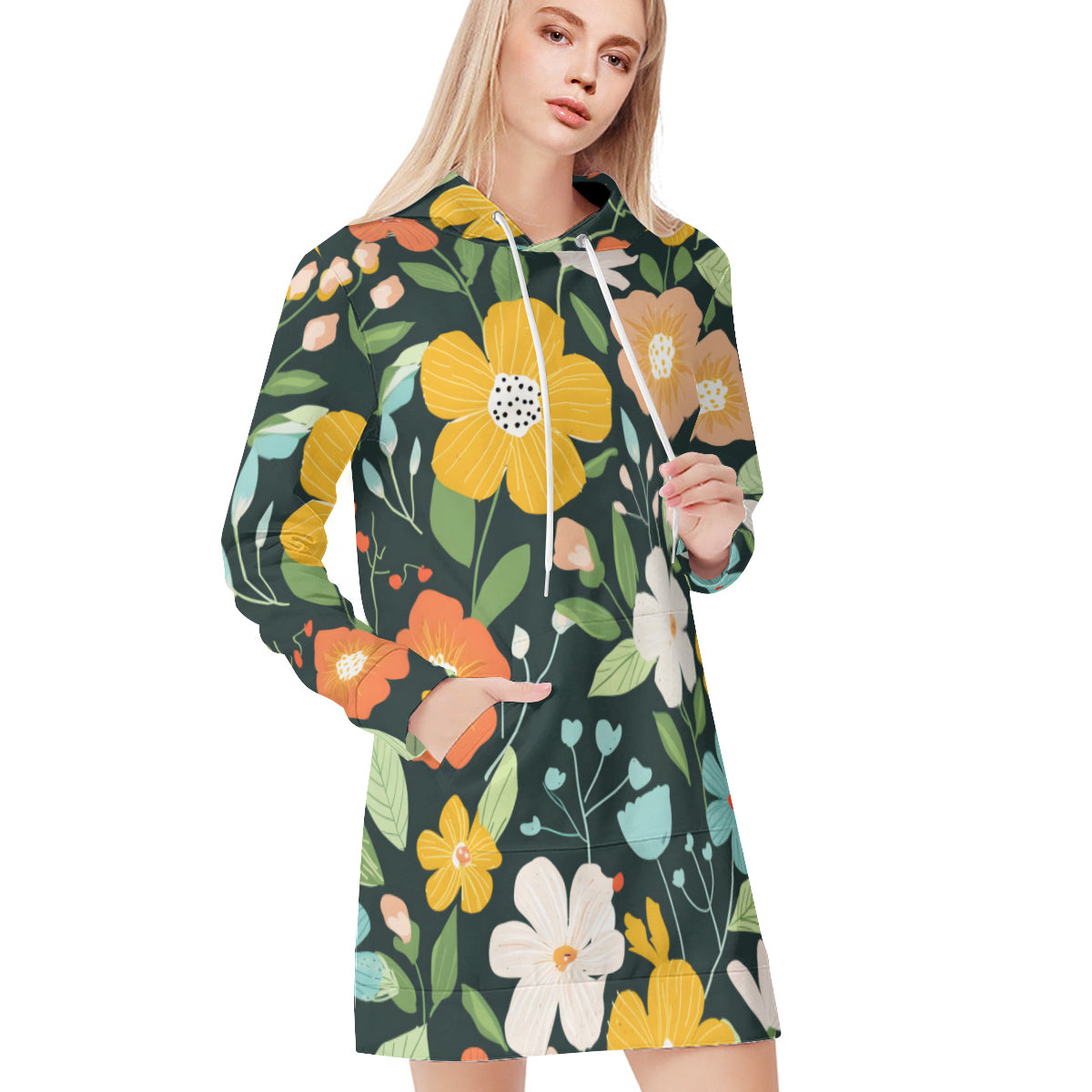 Floral Seamless Pattern Women Long Sleeve Casual Hoodie Sweatshirt Dress